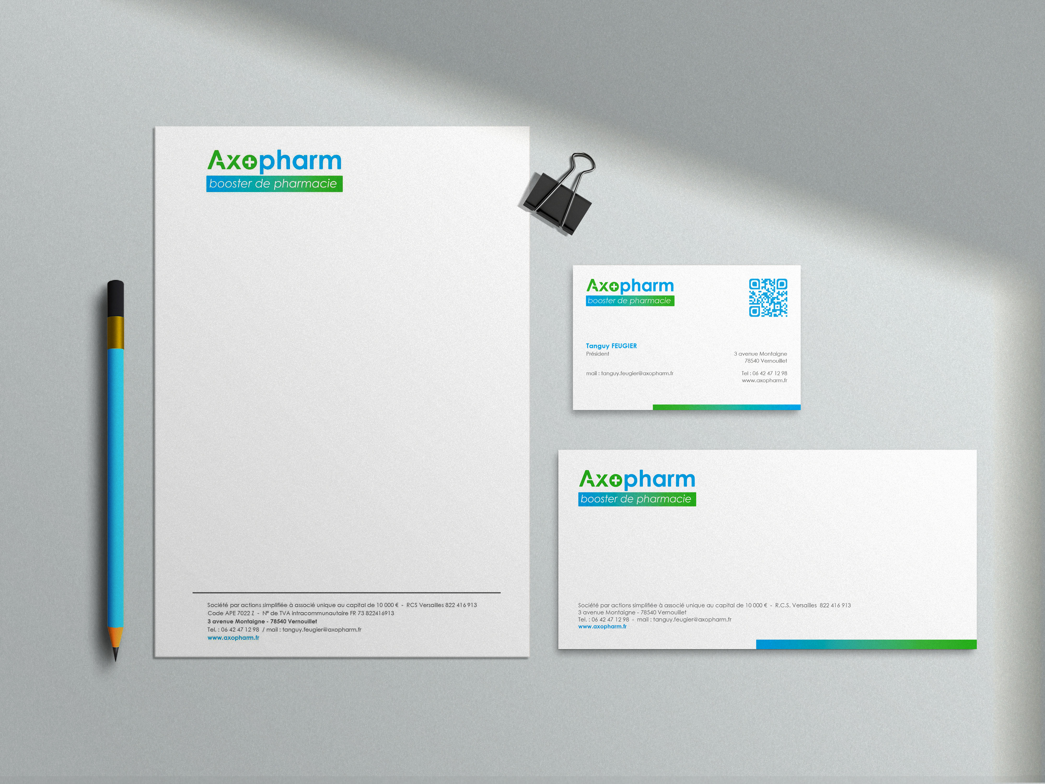 Réalisation de la Charte graphique (logo, carte de visite, tête de lettre et carte de correspondance) pour Axopharm.